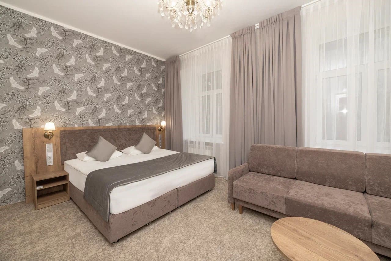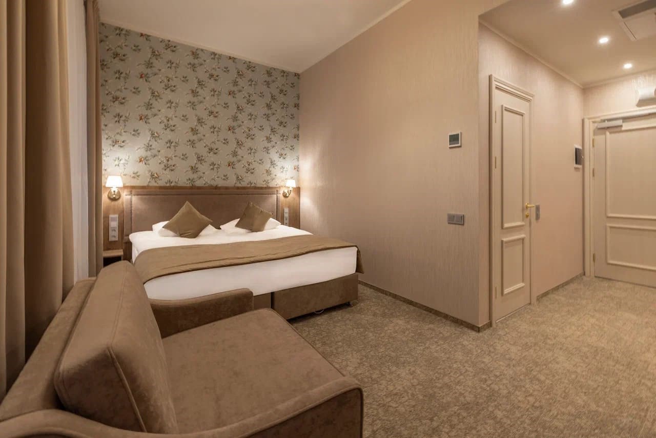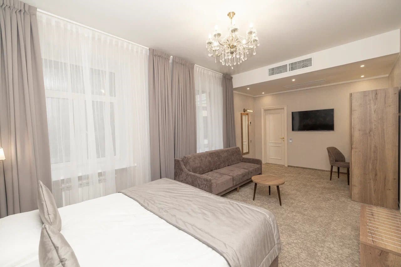Идеальное решение для большой семьи или компании друзей. Погрузитесь в атмосферу утончённого уюта и комфорта, которую предлагает наш номер, элегантно оформленный в светлых и нежных тонах. Здесь всё создано для вашего безмятежного отдыха: от изысканных обоев с деликатным рисунком до уютного текстиля, который ласкает взгляд и дарит ощущение домашнего тепла. Просторный номер наполнен мягким светом, струящимся из стильных светильников и люстры, которые создают особую атмосферу расслабления. Большая кровать приглашает вас окунуться в мир спокойного сна, а удобный диван у окна с видом на зелень станет вашим любимым местом для уединения с книгой или уютных бесед. Ванная комната, сверкающая чистотой и изысканной отделкой, подарит вам минуты расслабления и восстановления. Душевая кабина выполнена в современной стилистике, а каждый штрих продуман до мельчайших деталей, чтобы ваше пребывание у нас было незабываемым. Номера данной категории подходят для проживания вчетвером (2 основных места, 2 дополнительных на раскладном диване).