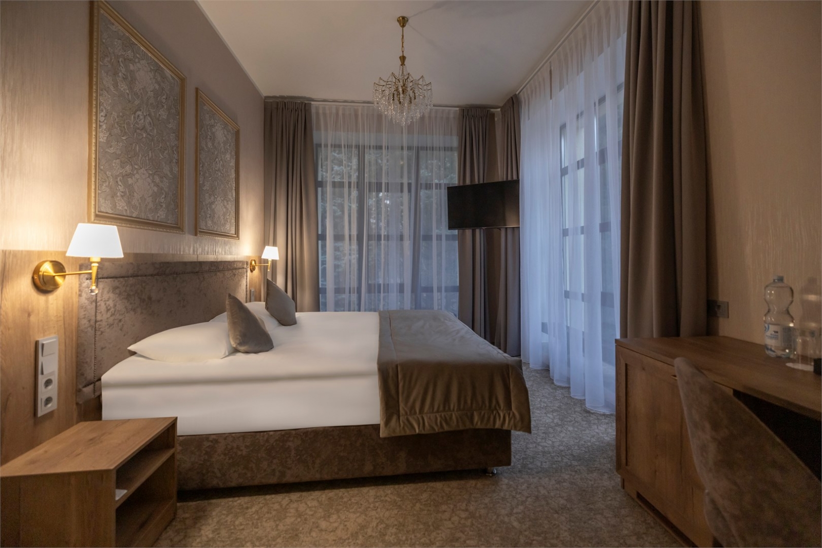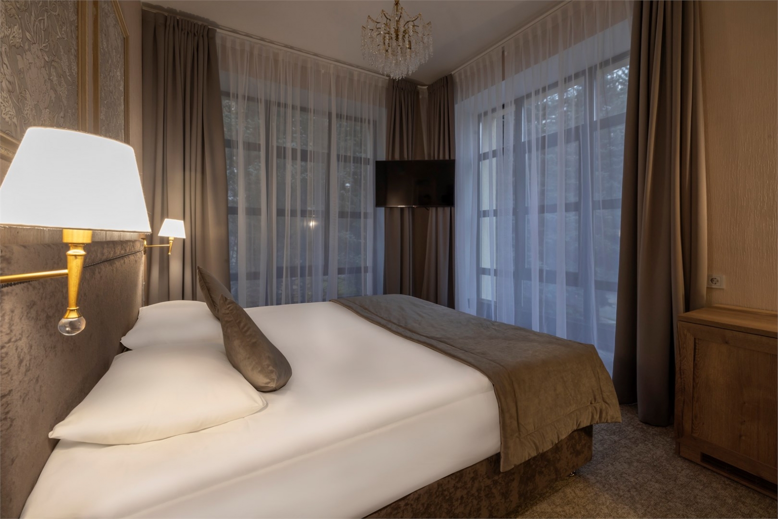 Создан для романтического отдыха и тех, кто ценит комфорт, стиль и впечатляющие виды. Добро пожаловать в ваш идеальный уголок уюта и спокойствия. Номер создан для тех, кто ценит элегантность и комфорт. Светлая палитра в сочетании с мягким освещением создает атмосферу безмятежности и тепла. Изящные люстры и качественные текстуры добавляют немного роскоши, а обилие света делает пространство воздушным. Этот номер с панорамным остеклением по периметру комнаты — ваше личное убежище от суеты, где можно расслабиться и насладиться моментом тишины.