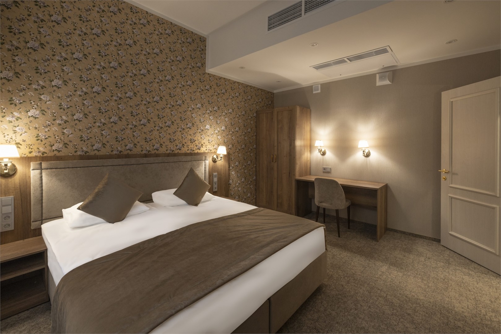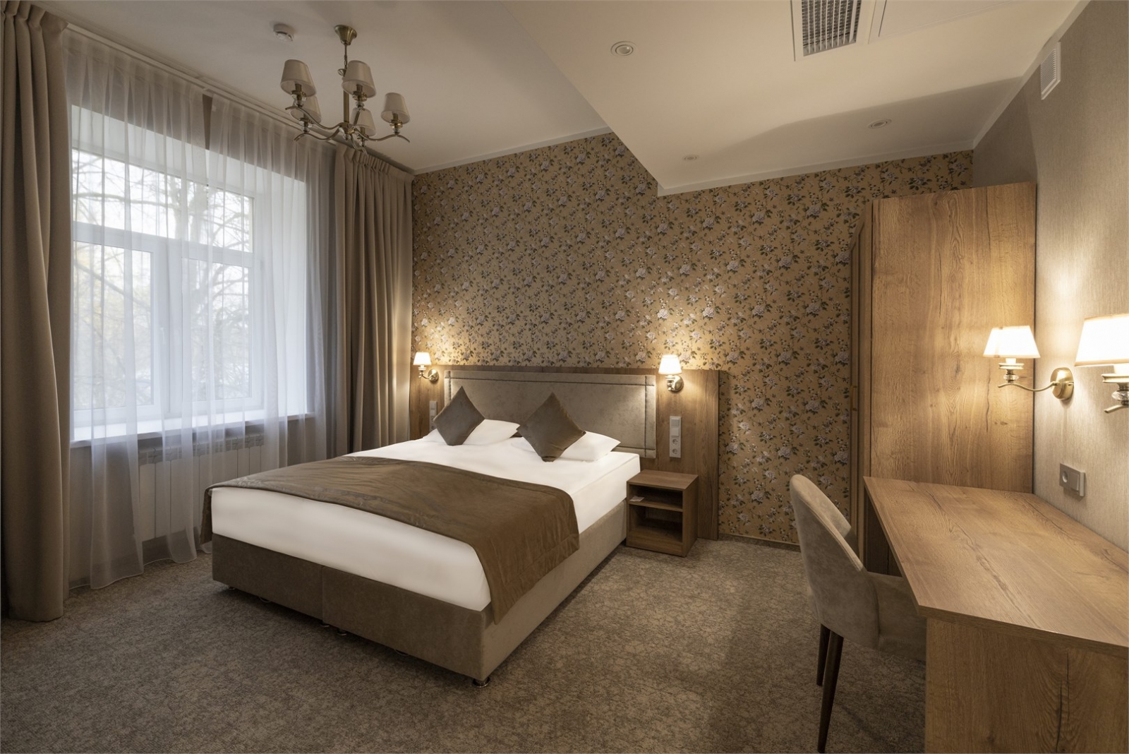 Подходит для семей с детьми и компаний, ценящих гибкость. В этом номере вас ожидает уютная атмосфера, наполненная светом и нежными пастельными тонами. Стены, украшенные цветочными мотивами, создают ощущение спокойствия и домашнего уюта. Большая кровать с мягкими подушками приглашает расслабиться после долгого дня, а кресло у окна — идеальное место для чтения книги или наслаждения видом. Изящная люстра и продуманное освещение в комнате добавляют нотку изысканности и тепла. Ванная комната выполнена в современном стиле с изящными деталями. Просторный душ с прозрачными дверцами и аккуратная раковина с круглым подсветкой зеркалом делают утренние ритуалы комфортными и приятными. Этот номер — идеальное убежище от суеты, где каждый элемент помогает расслабиться и ощутить гармонию.