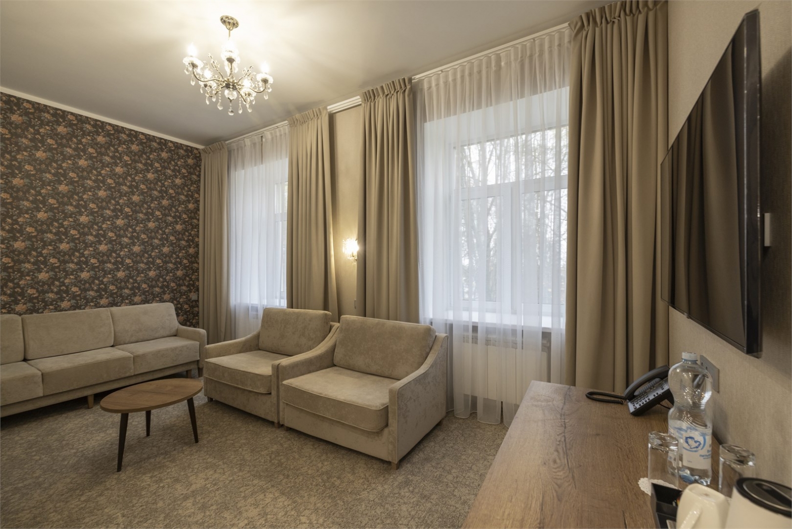 Номера данной категории подходят для проживания до 6 человек (2 основных места, 2 дополнительных на раскладном диване, 2 дополнительных места на раскладных креслах). Дополнительно может проживать 1 ребёнок до 3-х лет без отдельного места.