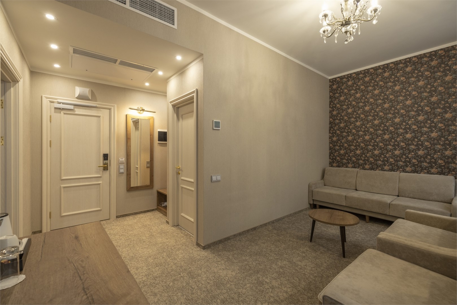 Номера данной категории подходят для проживания до 6 человек (2 основных места, 2 дополнительных на раскладном диване, 2 дополнительных места на раскладных креслах). Дополнительно может проживать 1 ребёнок до 3-х лет без отдельного места.