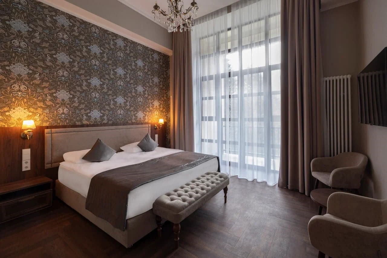 Современный и удобный вариант отдыха для двоих. Погрузитесь в атмосферу уюта и стиля, где каждый элемент продуман для вашего комфорта. Комната с теплой и спокойной цветовой гаммой, украшенная элегантными текстурами и изысканным декором, создает ощущение домашнего уюта. Большое окно пропускает мягкий дневной свет, нежно играющий на стенах и подчеркивающий теплые тона интерьера. Комната наполнена теплом и светом, создавая идеальное место для отдыха после насыщенного дня.