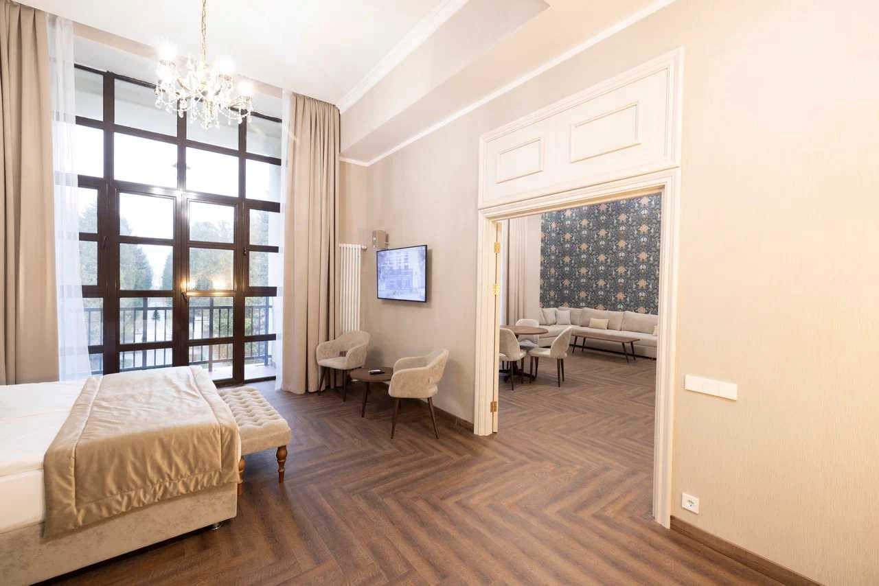 Вершина роскоши и технологий. Самый просторный и оснащенный номер курорта для безупречного отдыха VIP-гостей или большой семьи. Окунитесь в мир изысканного уюта и роскоши, которые окружают вас в этом великолепном номере. Мягкая цветовая палитра дополняется элегантными текстурами и классическим декором, создавая атмосферу спокойствия и гармонии. Просторная спальня обволакивает заботой и комфортом, где мягкое освещение и утонченные детали подчеркивают атмосферу уединения. В гостиной царит атмосфера благородства и уюта, приглашая вас расслабиться на удобных диванах после долгого дня. Свет мягко струится через большие панорамные окна, нежно подсвечивая изысканные детали интерьера. Просторная спальня с роскошной кроватью обещает сладкие сны, в то время как изысканная гостиная приглашает на дружеские беседы за чашкой ароматного кофе. Каждый элемент декора здесь подобран с любовью: от стильных обоев до изящной люстры, создающей атмосферу вне времени. Ванная комната - это настоящая ода современному дизайну, где каждое утро начинается с чувством свежести и обновления. Простор и функциональность встречают здесь эстетику, создавая идеальное пространство для расслабления. С балкона открывается роскошный вид на центральную парковую зону с многолетними елями и исторической аллеей курорта. Номер оснащены умной технологией, позволяющей создать идеальную атмосферу одним прикосновением или голосовой командой. Управляйте светом, выбирая идеальную яркость и цветовую температуру для чтения, романтического вечера или расслабления. Особенно впечатляет режим "Свеча", имитирующий живое пламя. Электрокарнизы открывают или закрывают шторы с помощью голоса или пульта, позволяя наполнить номер утренним солнцем или создать приватную обстановку. Полноцветная LED-лента добавляет современности интерьеру, позволяя выбрать любой цвет или режим: мерцание, переливы или статичный свет. Датчики движения в душевых включают свет автоматически, а система микроклимата позволяет голосом узнать температуру и влажность в номере. Центральный узел управления и развлечений, позволяющий управлять всеми системами номера, включать музыку и получать важную информацию. Этот номер позволяет Вам создать пространство, идеально подходящее под ваши желания. Всё под рукой или под голосом, что делает ваш отдых максимально комфортным. Вы будете чувствовать себя в авангарде современного гостеприимства.